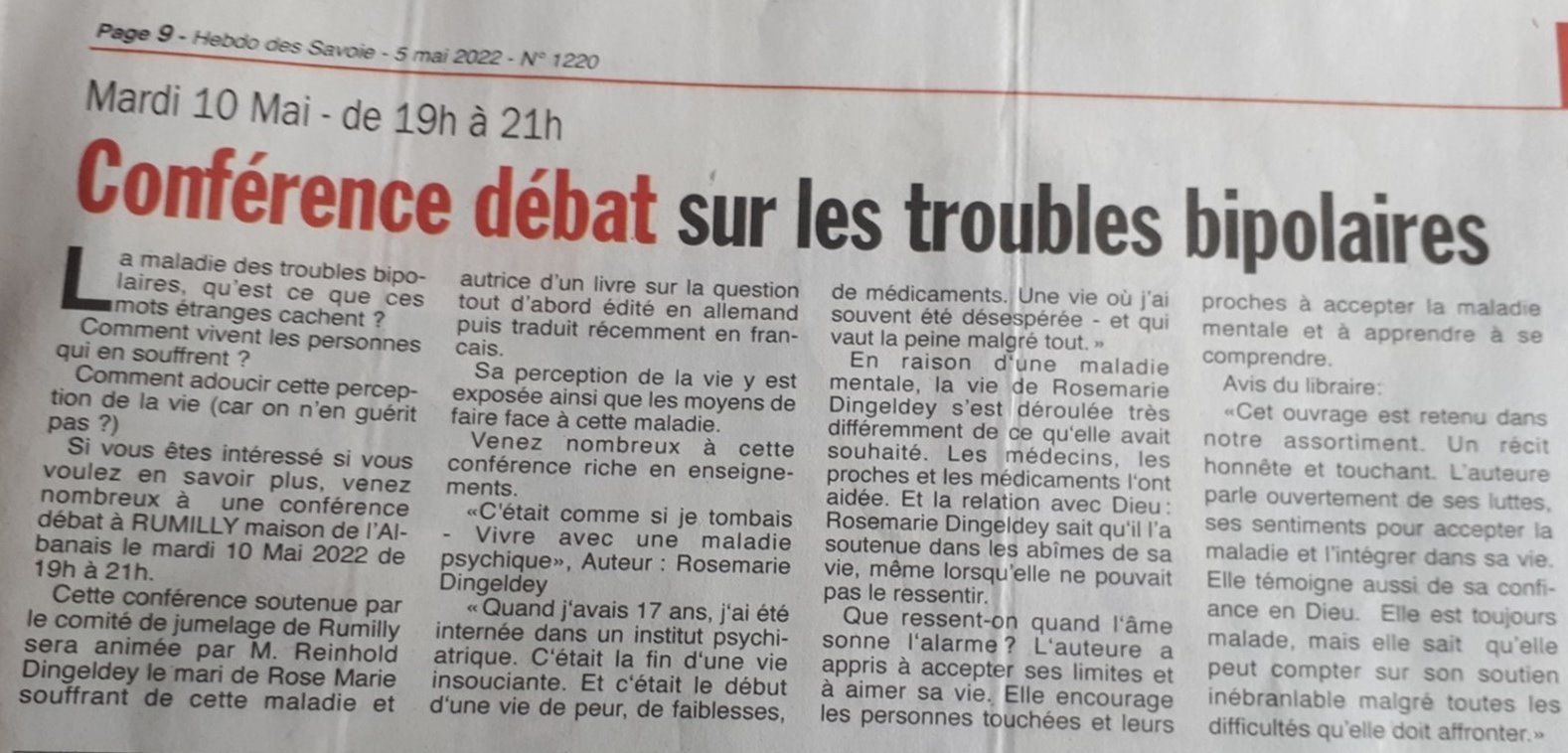Une conférence débat était organisé le mardi 10 mai à 19 heures avec le mari de l’auteure Rosemarie Dingeldey de Michelstadt ville jumelée de Rumilly. Après sa présentation comme ancien professeur de l’école professionnelle de Michelstadt qui a entrepris des échanges scolaires avec ses élèves depuis 2000 longtemps accompagné de sa femme Reinhold Dingeldey a commencé la lecture du livre intitulé « Cétait comme si je tombais … Vivre avec une maladie psychique ». Les passages soigneusement sélectionnés ont permis d’ouvrir le dialogue avec le public présent, plus de vingt personnes très intéressées au thème du trouble bipolaire, parfois touchée, parfois a ttirée comme proche d’un malade bipolaire. D’autres faisaient partie des amis du jumelage qui recevaient cinq membre du Club franco-allemand de Michelstadt pour un programme convivial d’échange et de découverte de l’Albanais.